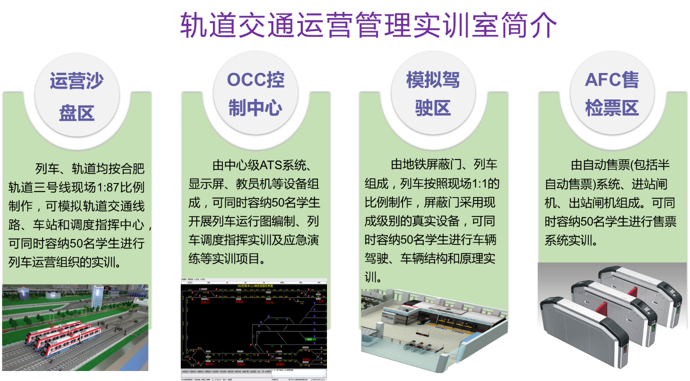 轨道交通运营实训中心面积400余平方米,累计投入四佰余万元。能开展车站行车设备认知、车站道岔操作、车站进路办理、车站正常情况下及非正常情况下的接发列车、车辆段接发列车等实训项目。能开展售票、检票、地铁屏蔽门检修、地铁模拟驾驶等实训项目。控制中心实训室能开展调度设备认知、列车运行图编制、列车调度指挥实训及应急演练等实训项目。