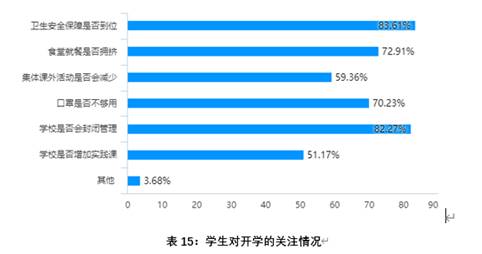 调查结果显示,学生身心状况良好,情绪平稳,疫情期间与家人相处更加融洽,在家中可以合理安排好自己的学习时间,对学校安排的线上课程评价总体良好。但也存在师生信息互通不够及时,部分学生对线上教学形式存在排斥心理等问题。对于开学后,学生比较关心的是“卫生安全保障是否到位”、“学校是否会封闭管理”、“食堂就餐是否拥挤”等问题。